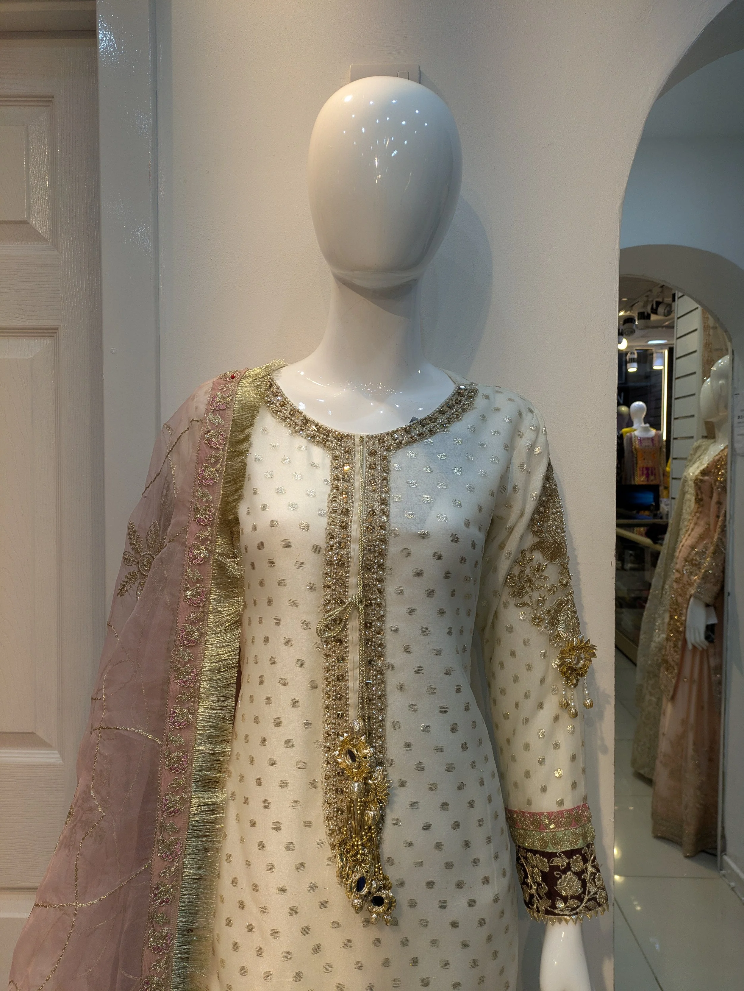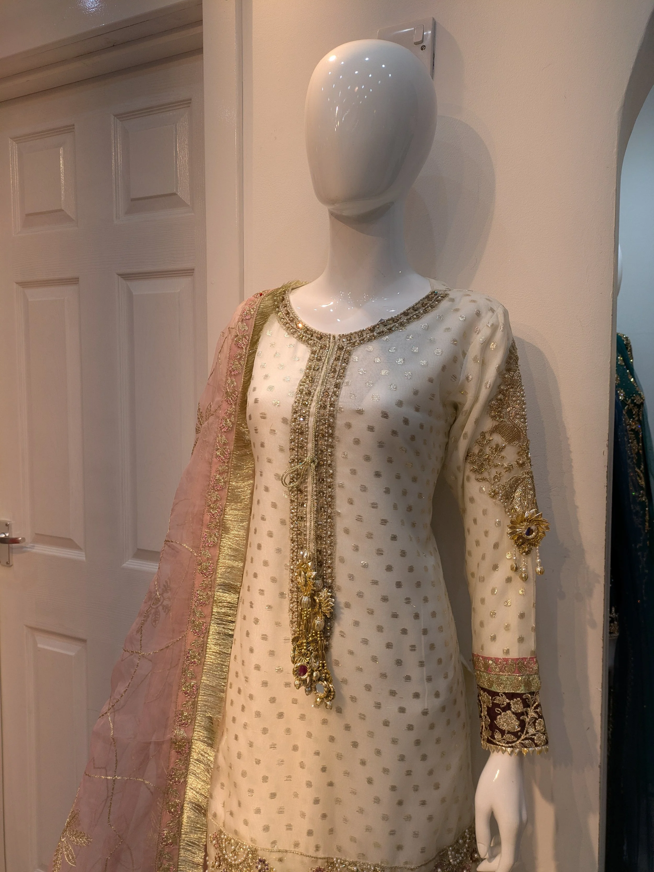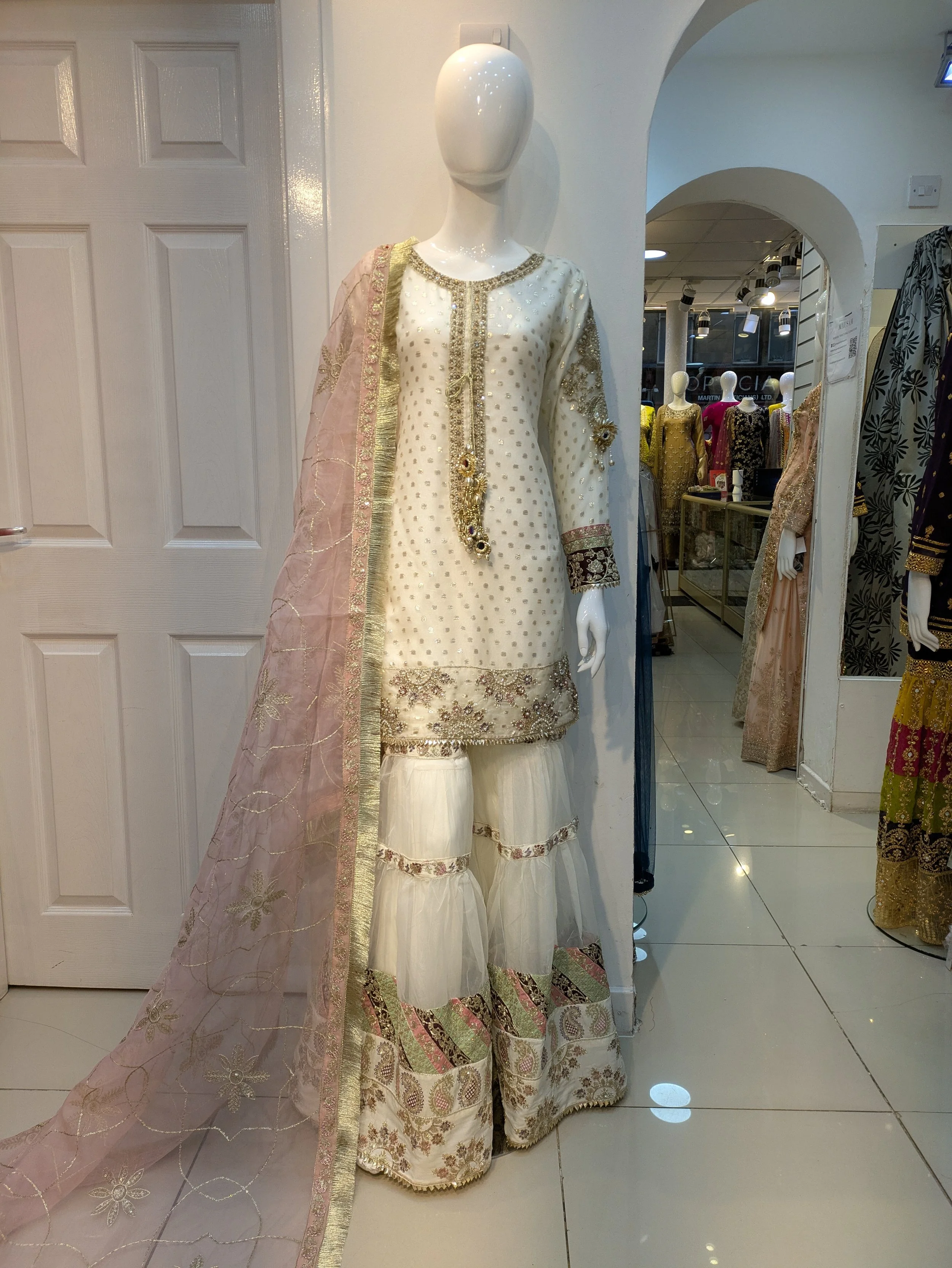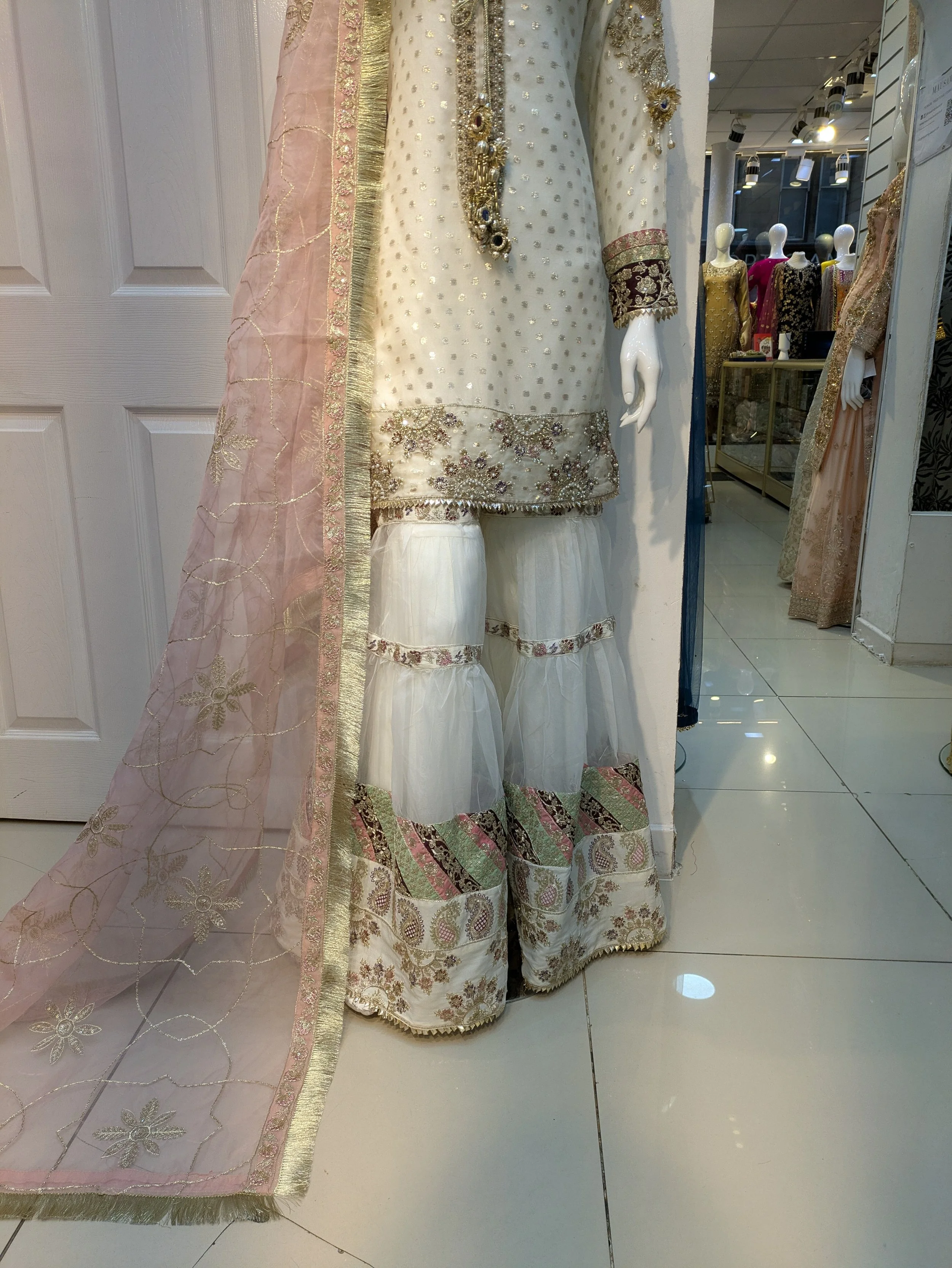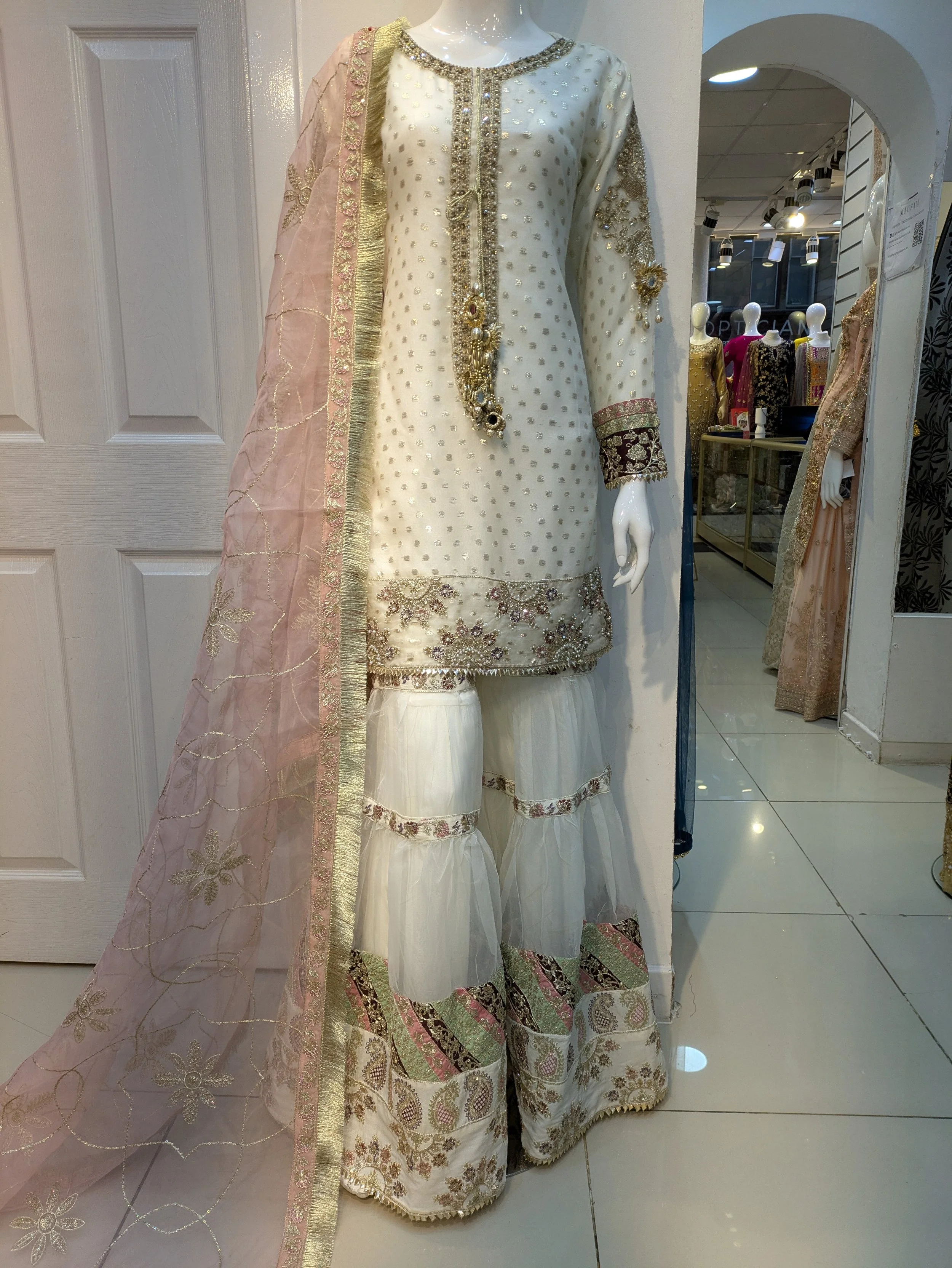 Formal Wear › 0480 Image 1 of 5 Image 2 of 5 Image 3 of 5 Image 4 of 5 Image 5 of 5 0480 £110.00 Shirt with ghara pkin duppta in organza Shirt on hand work gotta work marori work Ghara on work Patti work Size: Small Medium Large Add To Cart Added! Shirt with ghara pkin duppta in organza Shirt on hand work gotta work marori work Ghara on work Patti work