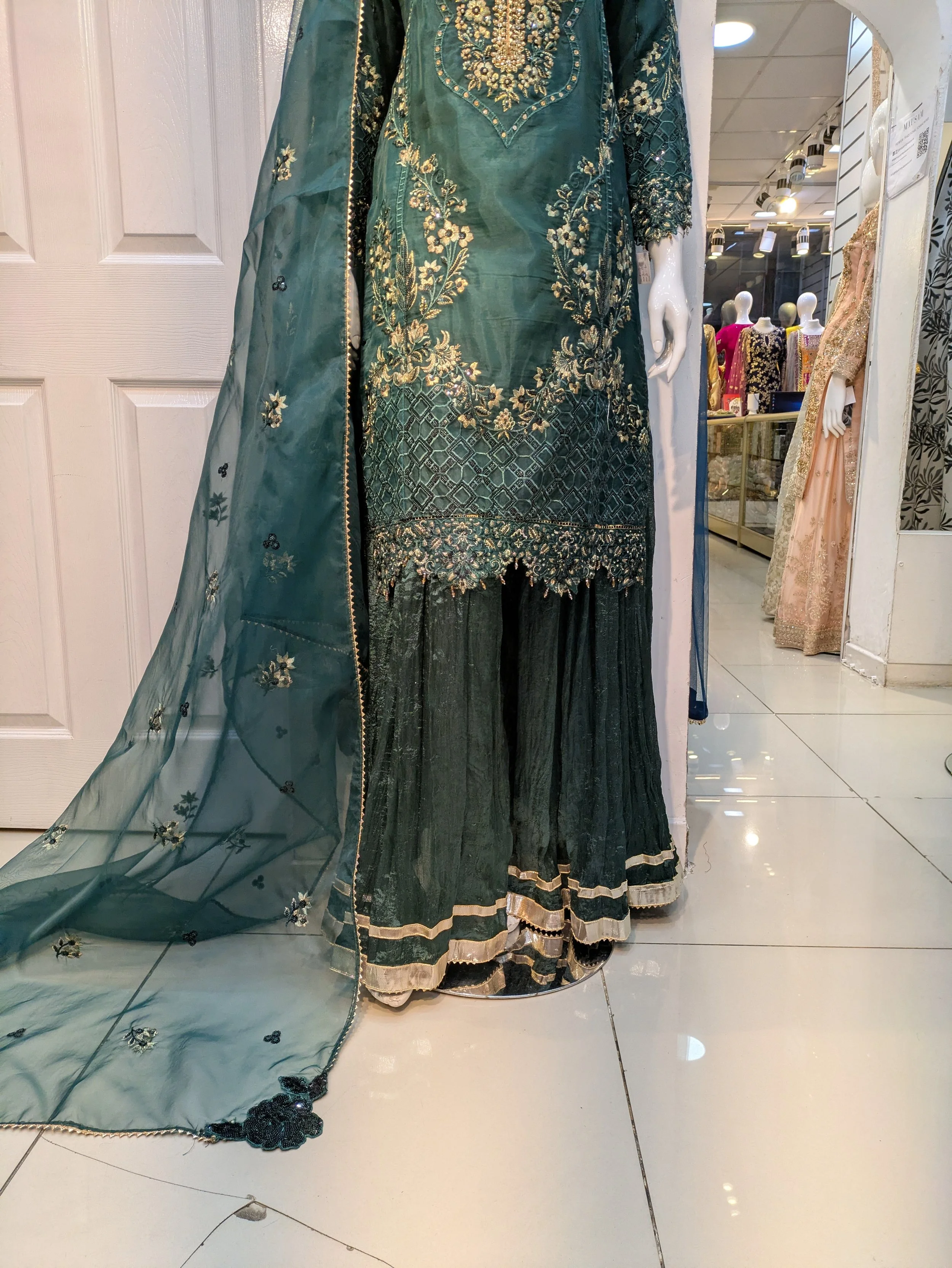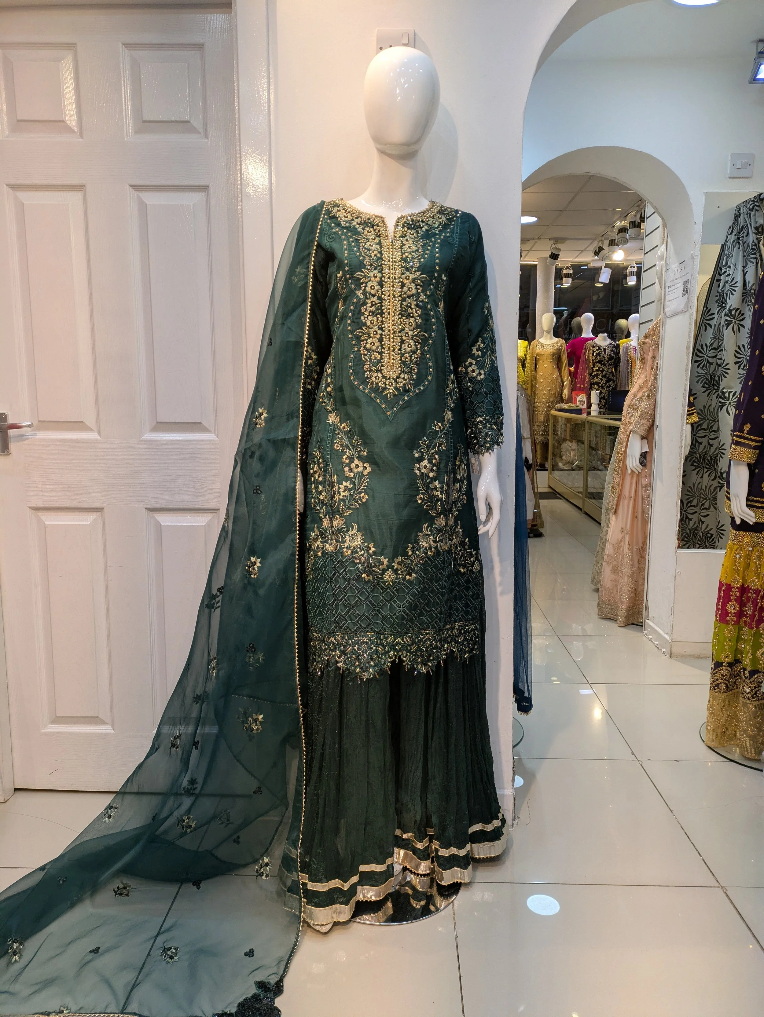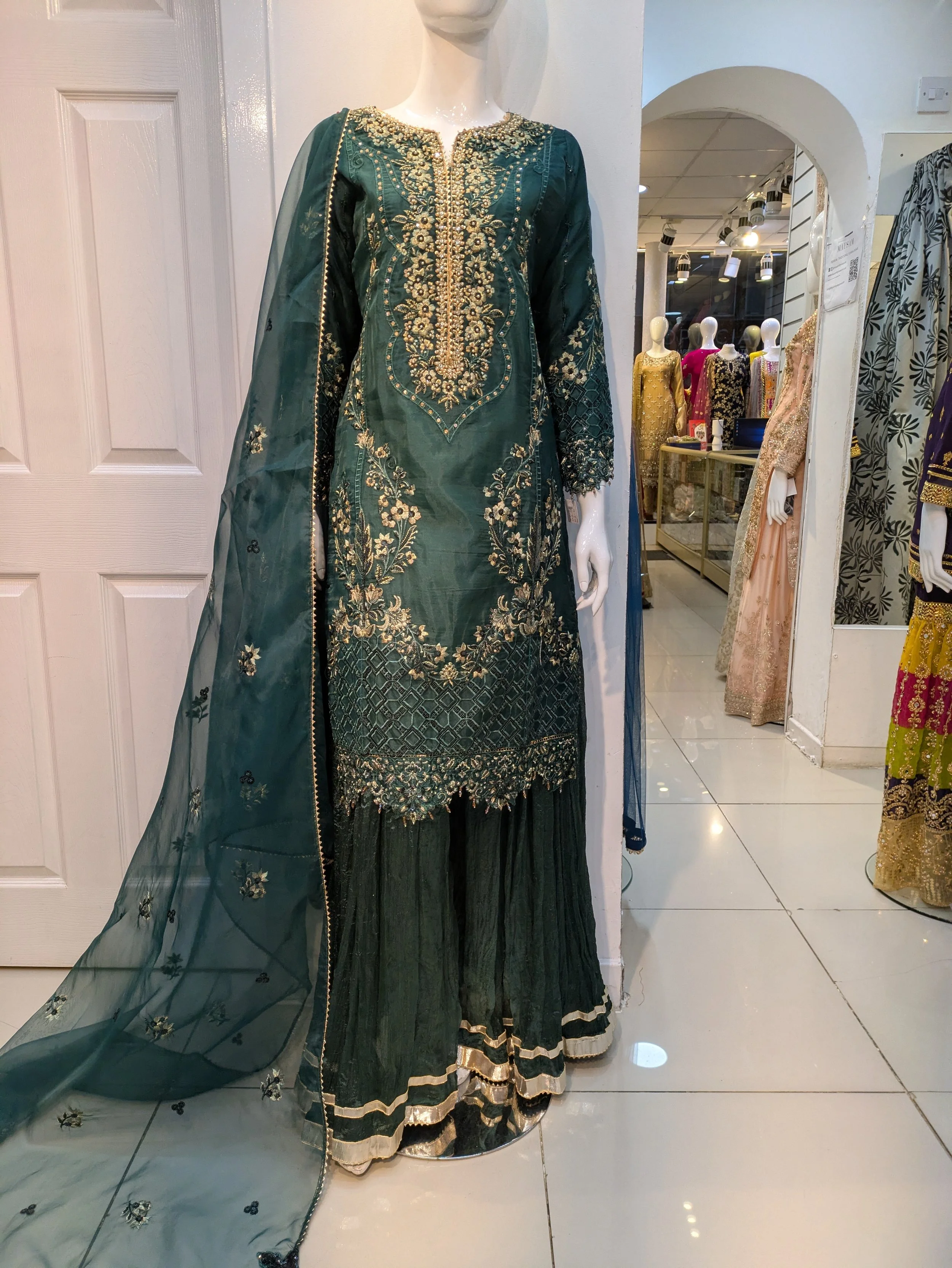 Formal Wear › 9669 Image 1 of 6 Image 2 of 6 Image 3 of 6 Image 4 of 6 Image 5 of 6 Image 6 of 6 9669 £89.00 Long shirt with sharara orgaza dubbata Hand work gotta with morori work Size: Small Medium Large Add To Cart Added! Long shirt with sharara orgaza dubbata Hand work gotta with morori work
